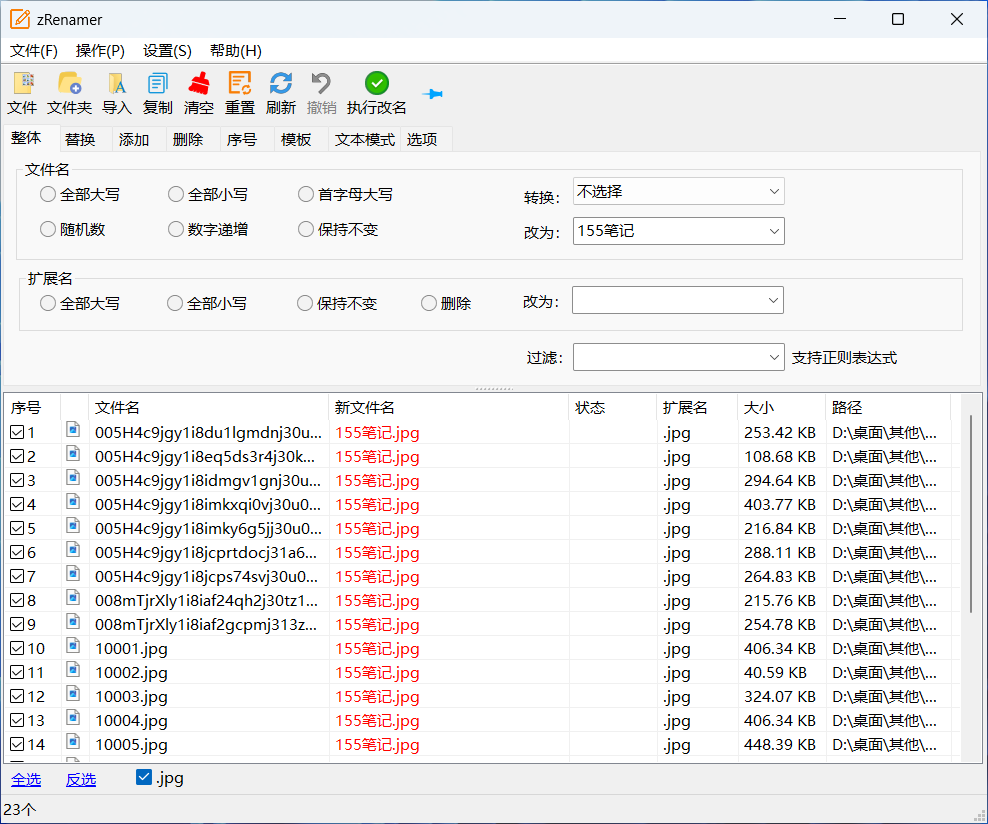 zRenamer 批量改名工具中文版是一款绿色便携、小巧高效的批量重命名神器,无需安装解压即开即用,兼容从 Windows XP 到 Windows 11 的全系列系统,支持拖拽文件 / 文件夹、右键操作及右键发送到等多种导入方式,集成序号、插入、删除、替换、模板自定义、正则替换等 9 种核心改名模式,搭配全部大写 / 小写、首字母大写、繁简转换、冗余字符清理等文本格式调整功能,还能导入导出改名配置、导出文件列表,支持搜索撤销与多语言切换,新增的元变量功能可调用当前日期时间、图片拍摄信息、分辨率等内容,无论是批量整理壁纸、照片还是办公文档,都能快速实现文件名统一规范,轻松解决文件命名混乱问题,大幅提升文件管理效率。
