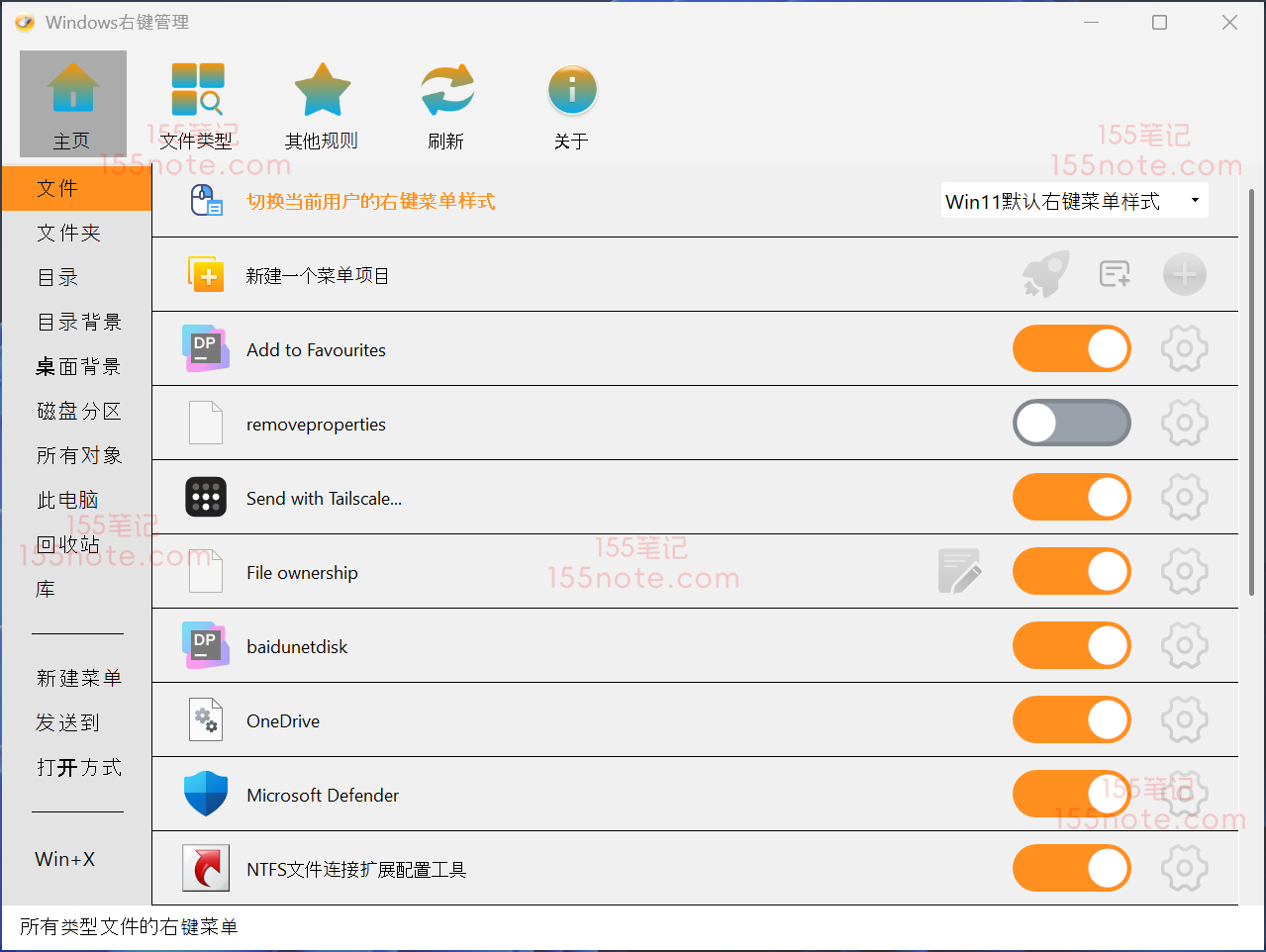 支持文件、文件夹、桌面、磁盘分区、新建菜单、发送到、打开方式、Win+X 等所有系统右键菜单场景,一站式管理所有右键条目。