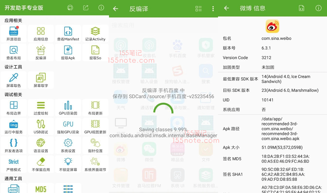 应用解析与资源提取:一键反编译应用,查看布局结构、控件信息与 Manifest 文件;可提取 APK 安装包和 So 文件,助力开发借鉴与调试。