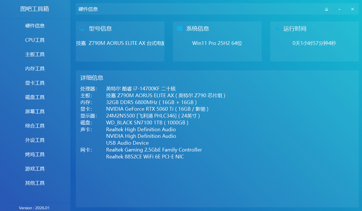 图吧工具箱(TBToolbox)是面向电脑硬件爱好者、DIY 玩家、系统维护人员及普通用户的免费开源硬件检测与系统维护工具合集,绿色免安装,解压即用,适配 Windows 全版本系统。集成 85 + 款业界权威工具,覆盖硬件信息查询、性能测试、稳定性验证、故障排查、系统优化等场景,无需单独下载零散工具,适配二手电脑验机、新机组装验收、硬件故障诊断、系统性能优化等需求,是兼顾专业与便捷的免费硬件工具解决方案图吧工具箱。