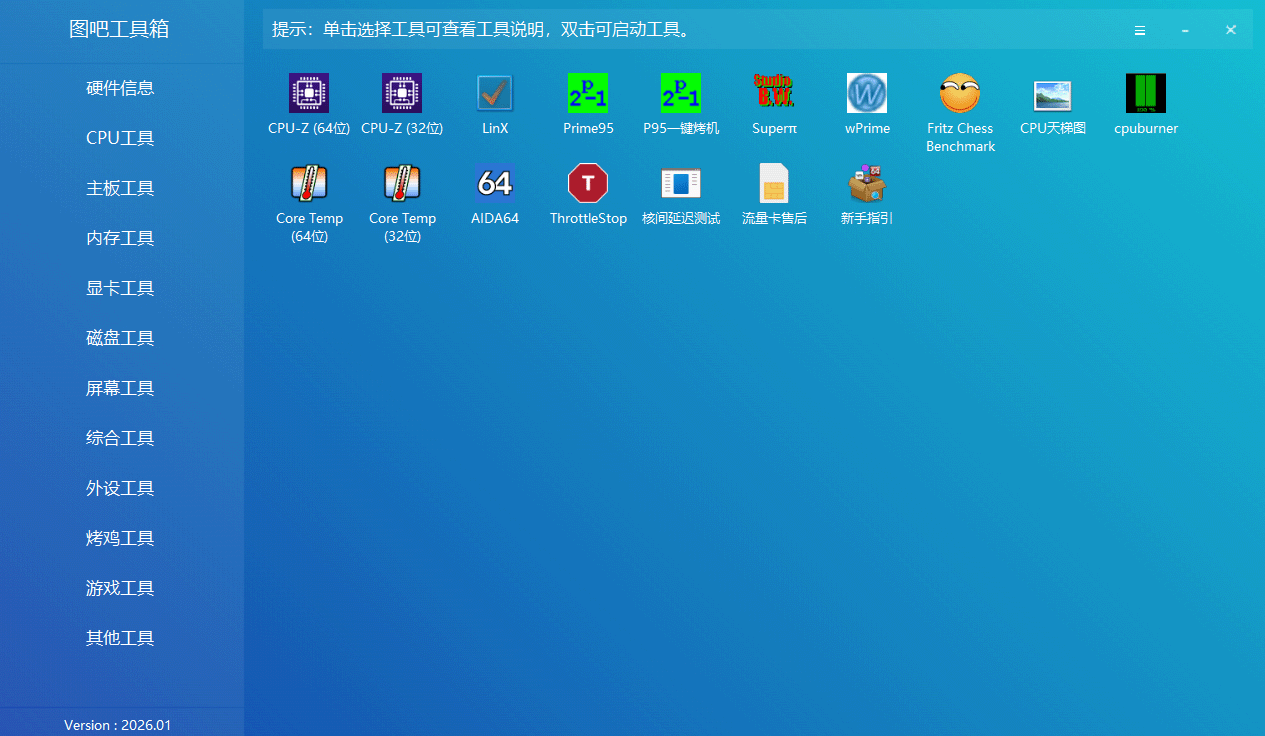 持续更新与工具集成:定期更新工具库与适配最新硬件,分类清晰(CPU / 显卡 / 内存 / 硬盘 / 屏幕 / 系统等),一键启动所需工具,新手也能快速上手图吧工具箱。