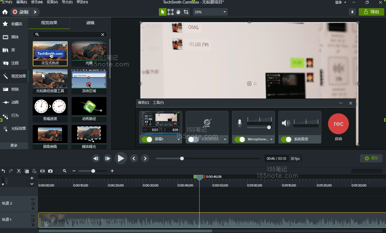 采用时间轴式编辑,支持无限音视频轨道,可添加转场、动画、标注(文本、箭头、形状)、光标特效(高亮、点击缩放),支持剪辑、调速、裁剪、绿幕抠像等操作。
