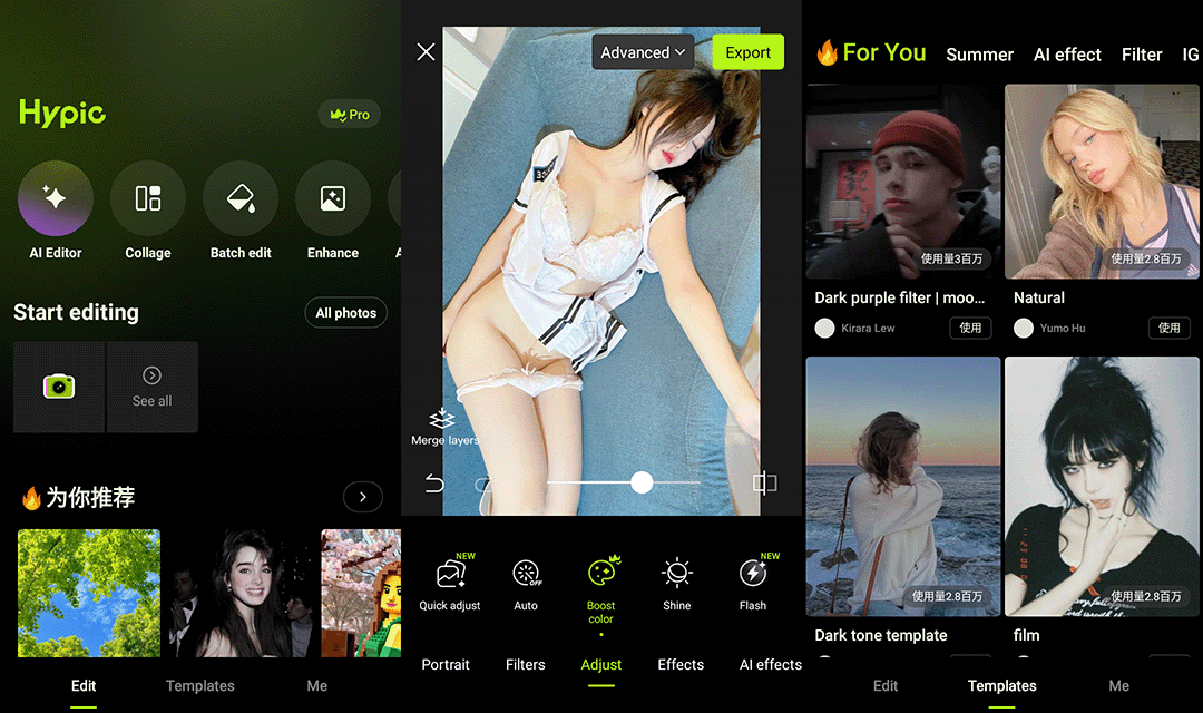 155笔记实测用了挺久的醒图和它的国际版 Hypic,是字节跳动推出的专业移动端修图工具。Hypic 在保留国内版核心修图能力的同时,做了更贴合全球用户的界面与功能优化,中文界面友好,启动快、运行流畅,无需复杂学习就能上手。不管是日常自拍美颜、风景图精调,还是社交媒体海报、证件照换背景,或是用 AI 生成创意头像、修复老照片,它都能一站式搞定。特别适合自媒体创作者、学生、职场人,还有喜欢随手拍的普通用户。