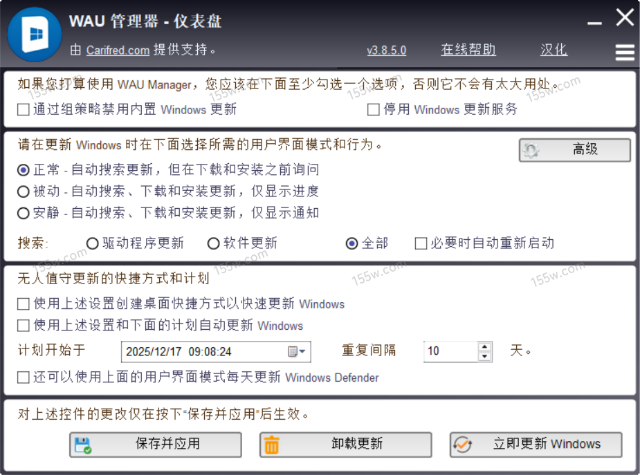 WAU 管理器 (Windows自动更新管理), 是 Windows 内置更新的替代品。该工具使您可以完全控制 Windows 更新,例如安装时间和方式,并为 Windows 更新提供全面的卸载和维护支持。